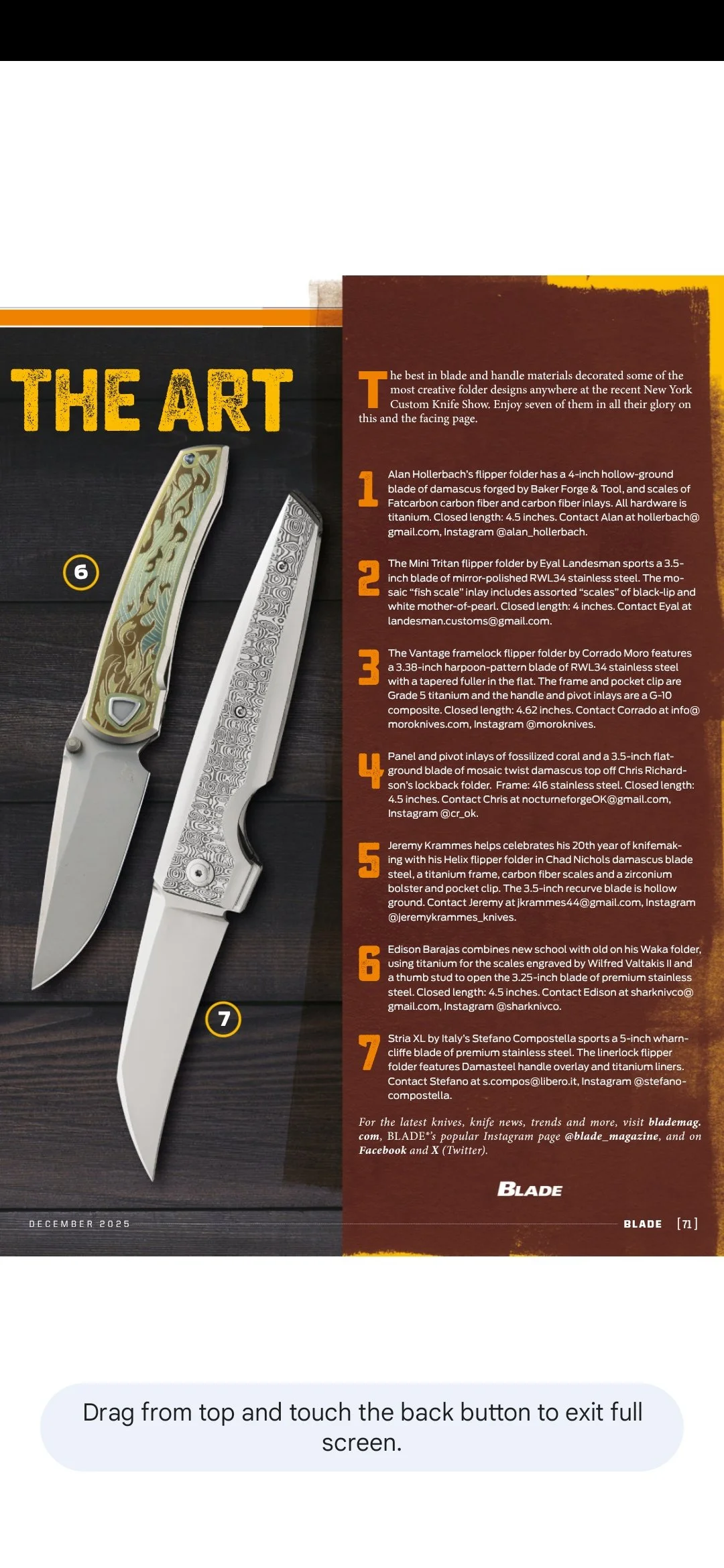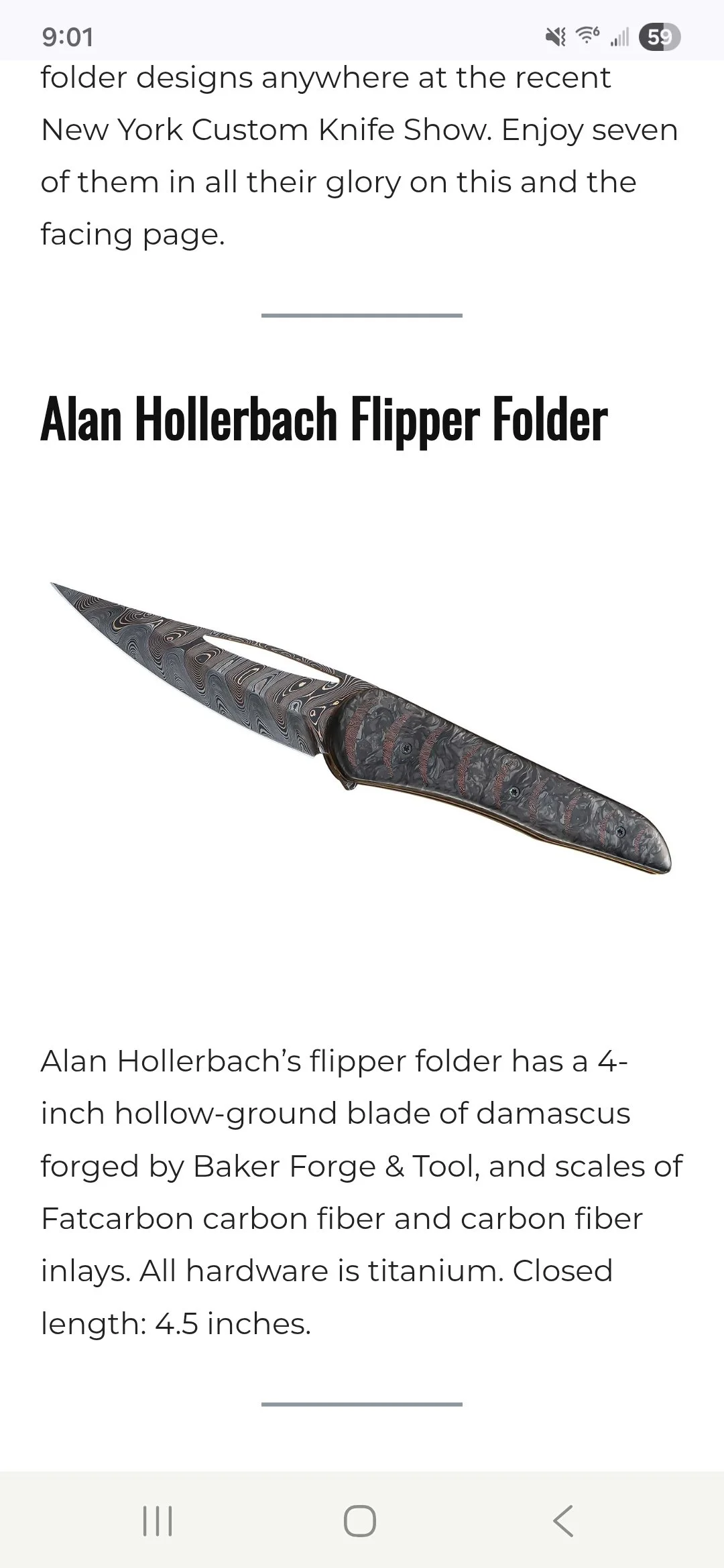 Spectre, Custom 1 of 1 Handmade knife. Baker Forge TigerMai Chevron pattern blade hollow ground. Scales are Fat Carbon Dark Matter with 18 Inlays of Fat carbon Space Coral. Titanium Liners and Screws. Skiff bearing running on hardened washers. Pivot is Alpha Knife Supply. Backspacer is Fat Carbon Dark Matter. Comes in Nanuk Case with DOB Card. Knife shown in Blade magazine December 2025 edition.
